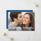 Se circunstâncias como o distanciamento social exigirem que você reduza o tamanho e diminua a presença no seu casamento, você pode deixar sua família estendida e amigos na sua lista de convidados original saberem que o seu casamento acontecerá, mas agora em uma escala menor com este anúncio de casamento reduzido. A frente apresenta sua fotografia de noivado favorita e "Mesmo Grande Amor, Novo Casamento Menor" escrito em grande letra cursiva branca contemporânea na parte inferior da sua foto, e abaixo você pode personalizar seus nomes e o anúncio de redução do casamento. No verso, você pode personalizar sua mensagem em mais detalhes e adicionar qualquer transmissão ao vivo, celebração futura e informações do site do casamento, tudo em tipografia branca contra um fundo azul clássico.
