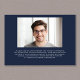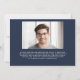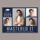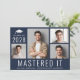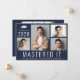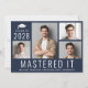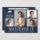 Cartão de anúncio de graduação de mestrado moderno azul escuro com uma colagem de fotos de 4 imagens, "Mestrou" escrito em letras brancas grandes e o ano de turma, nome e escola ou universidade do graduado em tipografia branca simples. No verso, adicione uma foto adicional e uma mensagem personalizada.