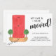 Você e seu gato estão se mudando para casa? Este cartão de anúncio em movimento apresenta uma porta vermelha e potes com impressões de pata de gatinho e tipografia de na moda. Você pode mudar o número na porta para o seu novo número. Facilmente personalizável. Original Watercolor © Michele Davies.