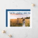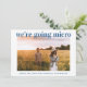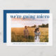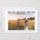 Um anúncio fresco e alegre para informar à sua lista de convidados original que as circunstâncias o obrigaram a reduzir o tamanho do seu casamento. "Estamos indo micro" está escrito no topo da sua foto de noivado favorita em tipografia azul clara moderna e limpa, e abaixo você pode personalizar seus nomes e anúncio de redução. No verso, você pode personalizar sua mensagem em mais detalhes e adicionar informações de transmissão ao vivo e site do casamento, tudo em tipografia branca contra um fundo azul clássico.