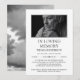 Honor your loved one with this minimalist funeral announcement card. The front features a sophisticated gray-bordered photo frame for a timeless portrait, paired with elegant serif typography. The reverse side showcases a serene, ethereal black-and-white cloudscape, symbolizing peace and transcendence. This clean, modern design offers a respectful way to share memories and service details. Perfect for those seeking a balance of contemporary aesthetics and traditional solemnity. Easily customizable to create a lasting tribute.
