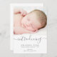 Uma visão moderna e mínima para compartilhar a notícia da chegada do seu bebê com sua família e amigos. Este anúncio de nascimento traz uma foto de solteiro com a apresentação em um roteiro de cinza manuscrito. Personalize com todos os detalhes importantes, incluindo o nome do bebê, a data de nascimento, o estado de nascimento e os nomes dos pais.