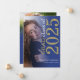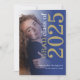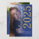 Anúncio de graduação do Dourado 2025 azul moderno 2 fotográfico. Um na moda e design de fotos para anunciar a notícia do formando da classe do mais velho, com na moda grande tipografia rotacionada e do lado direito no topo, branco e ouro. Personalize facilmente o resto do texto, incluindo a sua mensagem no verso. Substitua as fotos nos modelos de cada lado por suas próprias fotos.