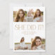 Este moderno ouro fete que ela fez é um cartão de anúncio de graduação de fotos é o perfeito segundo grau simples ou anúncio de formando universitário. A design apresenta uma elegante tipografia de vassoura com um toque de estilo sofisticado em ouro e branco minimalistas. Personalize a frente do cartão com 4 fotos, o nome do seu formando, a escola e o ano de aula.