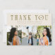 Modern and minimal graduation announcement photo card featuring 3 photos on the front and 1 on the back. The text at the top says "thank you." Add the graduate's name, information, and message to personalize this card. Cream color.