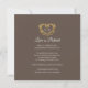 Um cartão de cancelamento de casamento com um monograma decorativo de coração em dourado antigo sobre branco e marrom escuro. Ideal para usar como cartão de informação de casamento para informar seus convidados sobre o cancelamento ou reprogramação de um casamento ou evento devido a doença ou circunstâncias imprevistas. Desenho decorativo de coroa de flores com seu próprio monograma inicial. Em efeito dourado lê-se "casamento cancelado, o amor é paciente". Outras opções de cores e itens correspondentes estão disponíveis. Desenho original de Sarah Trett para www.mylittleedenweddings.com