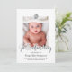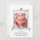 Cartão de foto moderno e trendy para apresentar o mais novo membro da família, em preto, branco e folha de prata falsa, uma foto do bebê, seu monograma e uma escrita à mão.