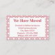 Você pode personalizar o texto branco com seu nome e novo endereço. No topo, você pode personalizar o texto que diz "Nós Mudamos". Este anúncio comovente de Natal tem um padrão tradicional vermelho e branco. Todo o texto pode ser editado ou excluído.