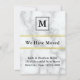 Você precisa fazer um anúncio em movimento? À frente, este falso cartão de mármore branco tem um texto preto personalizado no meio sobre um fundo branco (texto mostrado: Nós nos movemos'). Na parte inferior você pode personalizar seu cartão com seu nome e novo endereço. Há uma falsa borda dourada acima e abaixo do texto central. Dourado aspecto é uma renderização artística (sem folha). No topo, você pode editar o inicial para adicionar seu monograma que é dentro de um quadrado preto. O monograma e o quadrado preto também estão no verso.