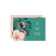 Um flamingo bonito vestindo um hibisco tropical é exibido contra uma folha de monstera lacrimogênea num fundo azul-esverdeado. O texto cor-de-rosa na frente da nossa mudança de endereço no cartão de anúncio diz: "Nós nos movemos" e essas palavras podem ser alteradas para você no modelo, juntamente com as novas informações de endereço na parte traseira do cartão.