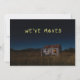 A mudança no cartão de anúncio de endereço mostra uma casa pequena e velha numa noite escura, com uma figura assustadora numa janela laranja. O texto amarelo diz "Nós nos movemos" acima da casa assombrada. A parte traseira do cartão inclui o novo endereço e outras informações de contato que podem ser personalizadas e personalizadas. Anuncie sua jogada com diversão e humor.