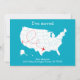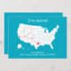 Anuncie seu grande passo em estilo com este cartão turquesa "Eu me Movi", com um mapa dos Estados Unidos com uma rota de linha pontilhada de avião vermelho da Califórnia para o Texas. O lado frontal inclui texto personalizável para o seu novo endereço e a mensagem em negrito "Movimentei". O verso oferece espaço para uma nota personalizada compartilhar atualizações ou sentimentos com a família e os amigos. Este design único e personalizável facilita a manutenção dos entes queridos no círculo sobre sua nova aventura.
