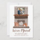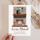 Anuncie sua mudança e novo endereço para amigos e família com nosso anúncio exclusivo da Lareira rustic Farmhouse! O anúncio em movimento do outono mostra a foto da sua família quadrada em uma estrutura de madeira escura montada em uma lareira de tijolos marrom. O manto de lareira é decorado com uma terra de folhas de outono de cor d'água com travesseiros de verificação de búfalos laranja, velas brancas e abóboras laranja e branca localizadas no coração. Personalize o anúncio de movimentação de fotos da família com seu nome, endereço e outro texto. A parte traseira fornece espaço adicional para texto e imagens. O cartão de anúncio em movimento é perfeito para o outono e Ação de Graças.