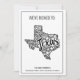 Envie a sua família e amigos este novo endereço do boho Texas, movendo a carta de apresentação. Esta design moderna apresenta uma ilustração a preto e branco do estado do Texas, acentuada por uma mandala floral. A parte superior da placa diz "Nós nos mudamos para:" Abaixo da ilustração de estado está seu nome e novo endereço para personalizar. A parte de trás do cartão postal tem uma mensagem e uma assinatura que você também pode personalizar. Desenhada por Susan Coffey.