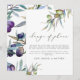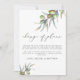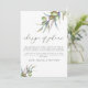 Um design elegante para anunciar uma mudança nos seus planos de casamento. Com belos ramos de oliveira e folhas verdes em aquarela, com um título "mudança de planos" em caligrafia moderna verde escura, sua mensagem em fonte sans serif preta, em um fundo branco. O verso apresenta um padrão de azeitonas e folhas em aquarela preta e verde.
