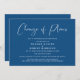 Anúncio de mudança de planos de casamento moderno e minimalista, com um tom alegre em azul clássico e tipografia branca. "Mudança de Planos" é escrito em uma fonte estilosa e você pode personalizar facilmente se o casamento foi cancelado, a data foi adiada ou alterada ou se outros detalhes foram alterados.