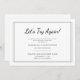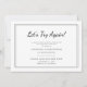 Anuncie para a sua família e amigos uma mudança na data do seu casamento com este cartão simples e elegante. O design apresenta um fundo branco limpo com uma borda preta e a saudação "Vamos Tentar Novamente!" O texto personalizado permite que você adicione os nomes da noiva e do noivo e uma nova data e local de casamento.