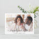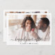 O anúncio moderno do noivado com a sua foto foi sobrecarregado com "feliz para sempre" em um roteiro de na moda com pestanas e seus nomes unidos com um coração. No verso, adicione duas fotos adicionais, personalize sua mensagem e adicione seus nomes em um script semelhante a assinatura.