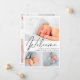 Um anúncio de nascimento simples e elegante. A frente apresenta uma colagem de 3 fotos de seu recém-nascido, sobrecarregado com "Bem-vindo" em um roteiro de na moda e o nome do seu bebê, data de nascimento e estatísticas de nascimento em tipografia de serifa clássica. No verso, adicione 3 fotos adicionais e sua mensagem personalizada.