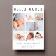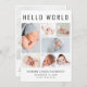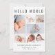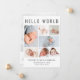 Um anúncio de nascimento elegante para apresentar seu bebê recém-nascido a amigos e familiares com "Hello World" em letras grandes, uma colagem de sete fotos e seu nome, data de nascimento e estatísticas de nascimento em uma simples tipografia moderna. No verso, adicione uma foto adicional e sua mensagem personalizada.