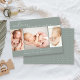 Este simples cartão de nascimento de colagem fotográfica moderno é perfeito para compartilhar as boas notícias da chegada do seu bebê. Ele apresenta uma colagem de fotos com três fotos em um fundo verde empoeirado. Adicione o nome do seu bebê e as estatísticas de nascimento para personalizar o cartão.