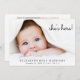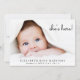 Simples anúncio de nascimento de fotografia para anunciar a chegada do seu bebê à família e aos amigos. A foto de seu recém-nascido preenche a frente e está sobrecarregada com "ela está aqui!" "ele está aqui!" ou "Estou aqui!" em um roteiro contemporâneo (você pode mover este texto para outra área no cartão para se adequar à sua foto selecionando a edição na ferramenta design). Adicione seu nome, data de chegada e estatísticas de nascimento. No verso, adicione quatro fotos adicionais, uma mensagem "bem-vinda" e os nomes dos pais e irmãos.