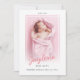 Cartão de anúncio de nascimento moderno para meninas. Adicione sua primeira foto na frente da placa no quadro branco na moda. O primeiro nome do seu filho pode ser adicionado como uma fonte de script rosa para reprodução. Seguem-se as estatísticas do meio e do sobrenome e do nascimento da criança. Você pode adicionar a segunda foto do seu bebê na parte traseira do cartão, junto com os nomes dos pais.