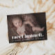 Um anúncio moderno de nascimento de uma foto de bebê com nome ousado e foto de paisagem na frente. O verso tem duas fotos e nomes de família. Clique no botão editar para personalizar este design.