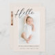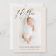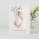 Anúncio de Nascimento da Foto do Bebê do Script Moderno. Cartão de aviso de nascimento com várias fotos, com lugar para uma foto de bebê na frente e três fotos menores na parte de trás. Design minimamente moderno com o guião Olá na frente do anúncio de nascimento.