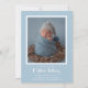 Os anúncios de nascimento elegantemente doces apresentam a sua foto favorita de um bebê recém-nascido em um fundo azul com um quadro azul e branco, o nome do seu bebê, estatísticas de natalidade e os seus nomes em qualquer fonte que você queira abaixo. No verso, altere a cor de fundo sob bolinhas brancas para qualquer cor que se ajuste à sua foto ou remova a camada de bolinhas. Você pode adicionar mais fotos no verso também!
