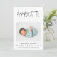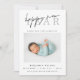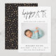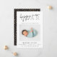 Cartão de nascimento de Ano Novo moderno e elegante. Design apresenta a foto do solteiro do bebê, a escrita do feliz ano novo em letras modernas, estatísticas de natalidade, nome, mensagem e padrão festivo de bolinhas de ouro no verso da carta. Maneira perfeita de anunciar o nascimento do seu bebê e desejar a todos um Feliz ano novo!
