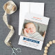 Anuncie seu novato do ano em estilo com esses cartões de anúncio de nascimento do tema do beisebol. Design apresenta um design moderno, mas clássico, com letras esportivas, pinstripes diagonais, detalhes de costura de baseball, uma foto de bebê, texto personalizado e estatísticas de nascimento de bebê. Esquema de cinzas, azul marinho, laranja e cor branca.