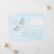 Um adorável cartão de anúncio aeronáutico com tema "baby", com ilustração digital de uma cinza e avião verde num céu azul com nuvem branca. "Nova Chegada" está na cinza moderna, e o nome do seu garotinho em jade verde. O reverso/backer apresenta nuvens brancas flutuantes em um céu azul claro.