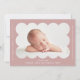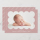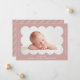 Anúncio de nascimento simples e moderno com a foto do seu bebê aninhada dentro de uma estrutura empoeirada de rosa. Personalize o anúncio empoeirado de rosa, adicionando o nome do seu bebê e informações adicionais em letras brancas. A parte traseira da placa apresenta um rosa empoeirado e um design de stripe mínimo branco.
