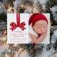 Apresentando nosso Anúncio Festivo de Nascimento do Arco Vermelho, um cartão maravilhosamente desenhado para celebrar a chegada do seu bebê nesta temporada de festas. Apresentando um delicado arco vermelho de aquarela sobre um fundo branco nítido, este design festivo inclui a palavra "introduzir" na elegante caligrafia vermelha. Abaixo, o nome do seu bebê, estatísticas de natalidade e uma mensagem personalizada são exibidos em letras clássicas de serifa. Uma foto vertical de bebê agarra a frente, enquanto a parte de trás mostra três fotos quadradas adicionais, enquadradas em branco, sobre um fundo vermelho vibrante. Perfeito para anúncios de natal e natal, este cartão captura o calor e a alegria da época.