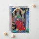Pintura colorida, vibrante e contemporânea em cores dourada, azul, vermelha, verde, castanha. Um misterioso feiticeiro hipnótico com fantasias elegantes de veludo vermelho segurando uma esfera mágica sentada num trono gótico com gargantas e coruja. Ambiente é surreal, fantástico, alquímico onde você vê um testículo é bebendo de uma xícara, um monge templar voando sobre um sapo, bolhas transparentes, paisagens de fantasia com fogo infernal, céu azul cósmico com estrelas, montanhas do céu, árvores .Egg Tempera em um painel de madeira com folha de ouro. 1989, Miniatura Feita com técnicas pictoriais de 1300 por Alessandro Lumini (c) É também uma bela design de fantasia para Natal, Férias, Aniversário, Dia da Véspera de Ano Novo, Mardi Gras e Saudações de Carnaval.