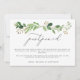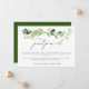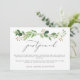 Um design simples e elegante para anunciar uma mudança nos seus planos de casamento. Caracteriza-se por belos ramos de folhas de eucalipto em verde aquarela, com um título "adiado" em caligrafia moderna cinza escuro, sua mensagem em fonte sans serif cinza escuro, sobre um fundo branco. O verso é em verde floresta sólido.