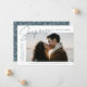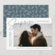 Compartilhe as notícias do seu noivado surpresa com estes anúncios elegantes do noivado fotográfico. A design apresenta a frase "Surpresa, nós nos envolvemos!" em um roteiro fumado de cinza azul e uma letra moderna. Sua foto de noivado é apresentada na parte central direita do design com seus nomes e data de noivado mostrada à esquerda. Personalize o anúncio do noivado surpresa adicionando detalhes adicionais abaixo, como cidade/estado do casamento, site do casamento, etc. O anúncio se reverte para exibir um padrão de folhagem branco em um fundo de cor azul-cinza.