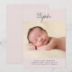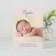 Este anúncio minimalista de nascimento de fotos apresenta uma grande foto, uma simples tipografia de script e uma paleta cor rosa e cinza. A frente do anúncio de nascimento inclui o primeiro nome do recém-nascido em letra manuscrita. Uma foto grande é posicionada abaixo do nome. No final do anúncio de nascimento, adicione o nome do cheio do bebê, a data de nascimento, as estatísticas de nascimento e os seus nomes. O texto é escrito em cinzas escuras de carvão vegetal contra um bonito fundo cor-de-rosa. Você pode adicionar fotos na parte traseira do cartão, se desejar.