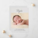 Este anúncio minimalista de nascimento de fotos apresenta uma grande foto, uma simples tipografia de script e uma paleta de cores de cinza neutra. A frente do anúncio de nascimento inclui o primeiro nome do recém-nascido em letra manuscrita. Uma foto grande é posicionada abaixo do nome. No final do anúncio de nascimento, adicione o nome do cheio do bebê, a data de nascimento, as estatísticas de nascimento e os seus nomes. O texto é escrito em cinzas de carvão contra fundo de cinza mais leve. Você pode adicionar fotos na parte traseira do cartão, se desejar.