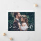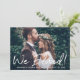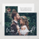Anuncie sua fuga romântica com estilo com este anúncio de casamento em pincel script. Um título ousado "Nós Fugimos!" em letras de pincel branco sobrepõe sua foto favorita na frente, com nomes e data abaixo. A parte de trás apresenta uma segunda foto ao lado de uma carta personalizável que compartilha a história de sua cerimônia privada. Substitua as fotos e edite todo o texto para torná-lo completamente seu.
