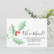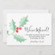 Ele é decorado com azevinho e frutas em tons de vermelho e verde e tipografia cursiva.