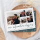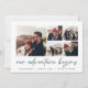 Um cartão de noivado moderno e excitante para o casal de espírito aventura, este design simples e limpo apresenta cinco fotos quadradas em um layout de colagem em grade, com "nossa aventura começa" embaixo de um roteiro escrito à mão. Personalize com seu anúncio, nomes e detalhes adicionais na parte inferior.