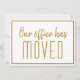 Temos um novo cartão de anúncio de mudança de endereço para uma empresa moderna, de negócios ou de chic, que pretende atualizar seus clientes em um novo local. Nosso escritório se mudou. Tipografia clássica e minimalista em cartões brancos e de ouro elegantes para sua empresa. Personalize a alteração de endereço no verso.