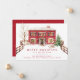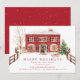 Anúncios eloquentes de férias com uma bela casa vermelha de aquarela com uma cerca de madeira que se estende pelas laterais da design. A casa de neve é decorada com flores festivas de férias com árvores e um trenó na frente. Personalize o anúncio comovente do Natal adicionando uma saudação personalizada e seu endereço abaixo em letras vermelhas. A carta se inverte para um fundo vermelho nevado.