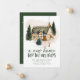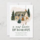 Anúncio elegante e comovente com uma confortável casa aquosa cercada por pinheiros com neve e coelho na frente. "Uma nova casa para os feriados" é exibida em letras verdes escuras. Personalize o design com seu nome e endereço. A carta se inverte para um fundo verde escuro nevado.
