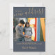 Foto personalizada anúncio de novo endereço em cinza azul escuro e ouro. O modelo de foto está configurado para você adicionar sua própria foto, que é exibida sangrando o cheio no formato paisagem. O "novo endereço" é inscrito na tipografia elegante escrita à mão e o restante texto é totalmente editável. O cartão de anúncio diz atualmente "temos um novo endereço ... você pode nos encontrar em [novo endereço ... seu(s) nome(s)] e o modelo está configurado para que você personalize como quiser. Uma design simples e moderna para deixar seus amigos, colegas e família saberem para onde vocês se mudaram.