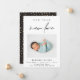Cartão de nascimento de Ano Novo moderno e elegante. Design apresenta a foto solteiro do bebê, novo ano de escrita amorosa em letras modernas, estatísticas de natalidade, nome, sua mensagem e padrão festivo de bolinhas de ouro no verso da carta. Maneira perfeita de anunciar o nascimento do seu bebê e desejar a todos um Feliz ano novo!