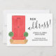 Este simples cartão de anúncio em movimento é decorado com uma porta vermelha a cores-d'água, plantas de pote topicário e tipografia de na moda. Facilmente personalizável. Mude o número na porta vermelha para o seu novo número! Original Watercolor © Michele Davies.