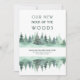 O nosso Novo Pescoço do Anúncio em Movimento do Woods, que você pode personalizar com seus nomes, novo endereço e quaisquer informações adicionais que você queira incluir. A design apresenta uma borda de aquarela de pinheiros verdes e tipografia decorativa para a manchete "nosso novo pescoço da floresta".